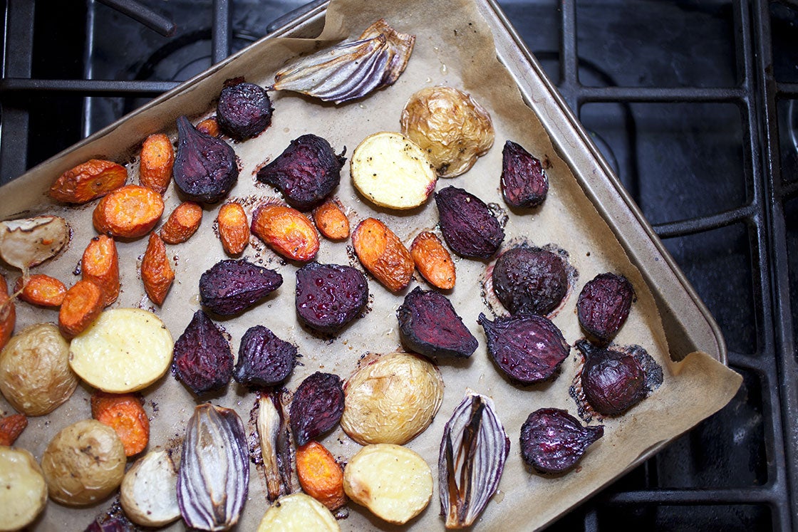Grab whatever looks good at the farmers’ market: carrots, cauliflower, sweet potatoes, butternut squash. Cut everything into roughly the same size chunks, toss in a bowl, drizzle with olive oil, season with salt and spices, and spread in a single layer on a baking sheet lined with parchment paper. (They’ll steam, not roast, if you crowd them too much.) Roast on high heat—but not higher than 425ºF, or the parchment could burn—stirring occasionally, 30 to 45 minutes, or until browned and caramelized. Add a few drops of good-quality balsamic vinegar for extra oomph. Then scoop up opposite ends of the parchment paper, slide some of the goodies onto your dinner plate, and toss the rest into a Tupperware for future bowls, stir-fries, pasta dinners, and salads. Place baking sheet back in cabinet, and veg out throughout the week.