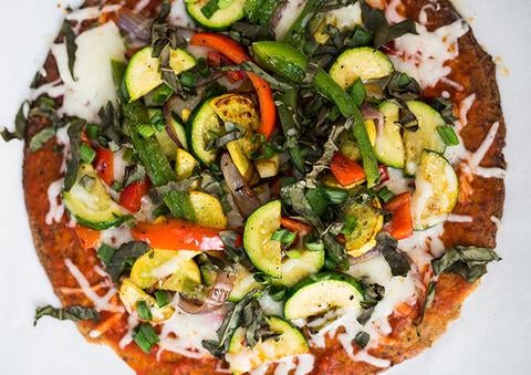 She came up with an original thin-style crust is made with cauliflower, cheese, eggs and spices—a flavorful, satisfying crust that’s perfect for toppings.