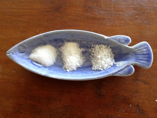 PHOTO (left to right): fleur de sel, kosher salt, and iodized salt
