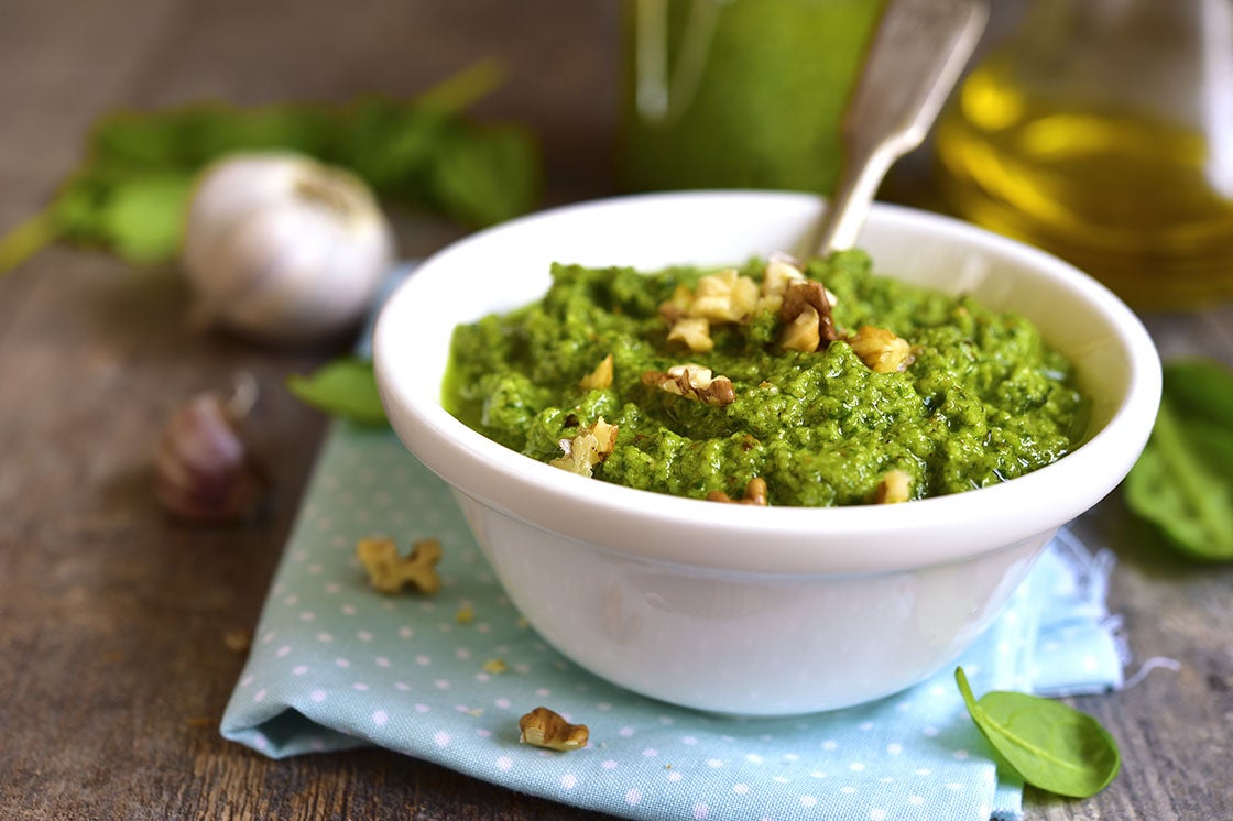 1. Preheat oven to 350F. Whisk flour and 1/2 cup milk in saucepan until smooth. Gradually whisk in remaining milk. Bring to a boil over medium heat, whisking constantly, and boil 1 minute, or until thickened. Remove from heat; stir in pesto, Parmesan, salt and pepper. Reserve 1 cup white sauce.
