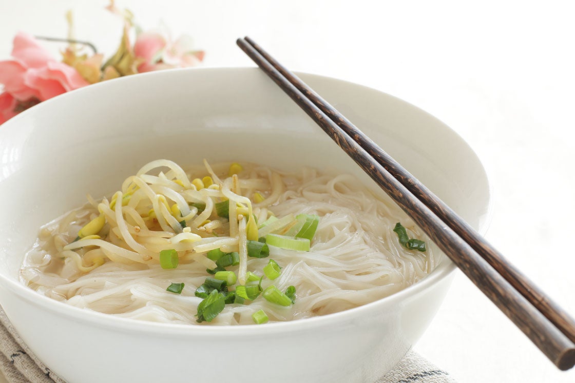 Rice noodles have less fat than their ramen-style counterparts because they’re not fried and there’s no added oil; the ingredients are just rice and water. My favorite way to eat rice noodles is in a simple but tasty soup that’s adaptable to every season. In winter, I might add a bit of golden-fried tofu cubes or rehydrated textured vegetable protein (shown in photo) and lightly steamed broccoli or other cruciferous veggies for a healthy crunch; in spring, asparagus or spinach give color and flavor; in summer, chopped tomatoes and fresh basil lend an Asia-meets-the-Mediterranean flavor; and in the fall, I toss in sliced chanterelles or oyster mushrooms for an earthy, autumnal bouquet.