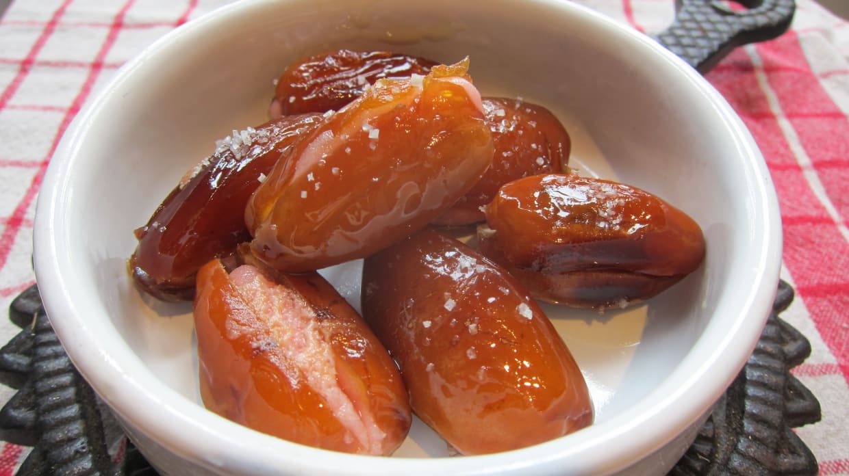 3. Add olive oil to a small saucepan; let warm over medium-high heat for 1 minute. Add dates and sautée one minute on each side. Sprinkle with sea salt before serving.